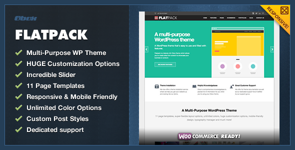 Grab this beautiful theme right now! Theme FlatPack - MultiPurpose Business WordPress Theme from obox is simply good. Its a professionally designed premium WordPress themes for your blog. WordPress has become the CMS of choice for millions of site owners. Picking the suitable theme for your blog determines the future of your site. Not only does a good theme makes a good first impression to your user, but it helps your SEO (bouncing rate). Theme FlatPack - MultiPurpose Business WordPress Theme info : Columns: 4+, Compatible Browsers: IE7, IE8, IE9, IE10, Firefox, Safari, Chrome, Software Version: WordPress 3.5, WordPress 3.4, WordPress 3.3, WordPress 3.2, WordPress 3.1, WordPress 3.0, Compatible With: WooCommerce 2.0.x, WooCommerce 1.6.x, WooCommerce.