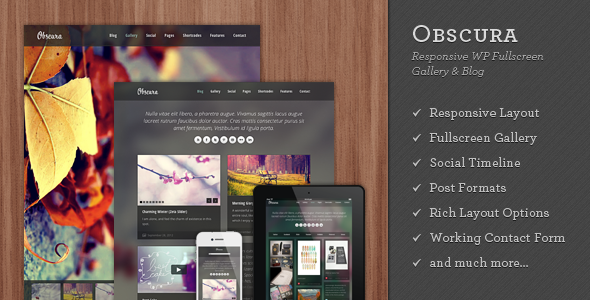 Grab this beautiful theme right now! Theme Obscura - Responsive WP Fullscreen Gallery & Blog from elemis is simply good. It is a professionally designed premium WordPress themes for your blog. WordPress has become the platform of choice for millions of site owners. Selecting the suitable theme for your blog determines the future of your blog. Not only does a beautiful theme makes a good first impression to your visitor, but it helps your SEO (bouncing rate). Theme Obscura - Responsive WP Fullscreen Gallery & Blog info : Compatible Browsers: IE8, IE9, Firefox, Safari, Opera, Chrome, Software Version: WordPress 3.5, WordPress 3.4, WordPress 3.3, WordPress 3.2, High Resolution: No, Widget Ready: Yes.